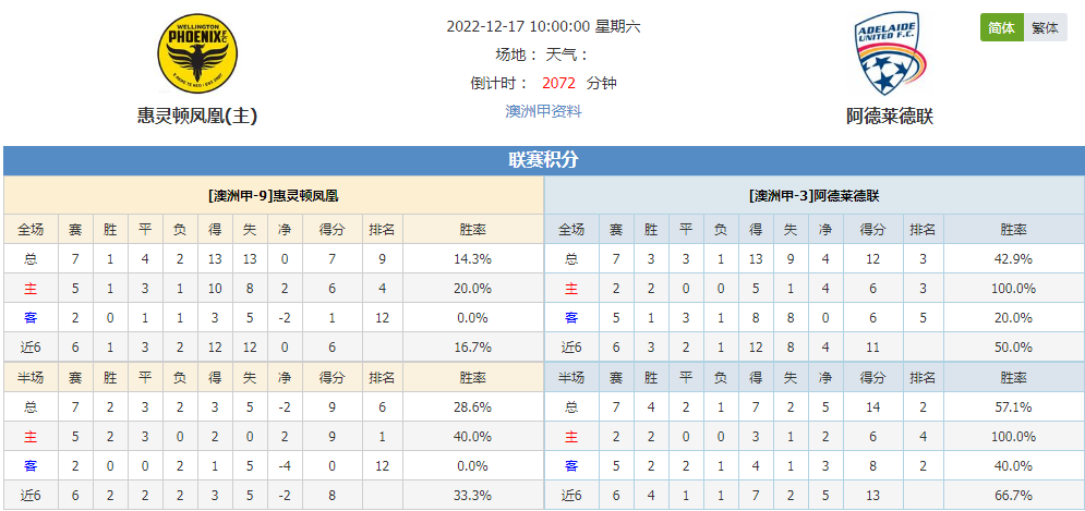 惠灵顿凤凰本赛季澳洲甲问题1胜4平2负,积分7,排名第9;阿德莱德联本赛季澳洲甲问题3胜3平1负,积分12,排名第3