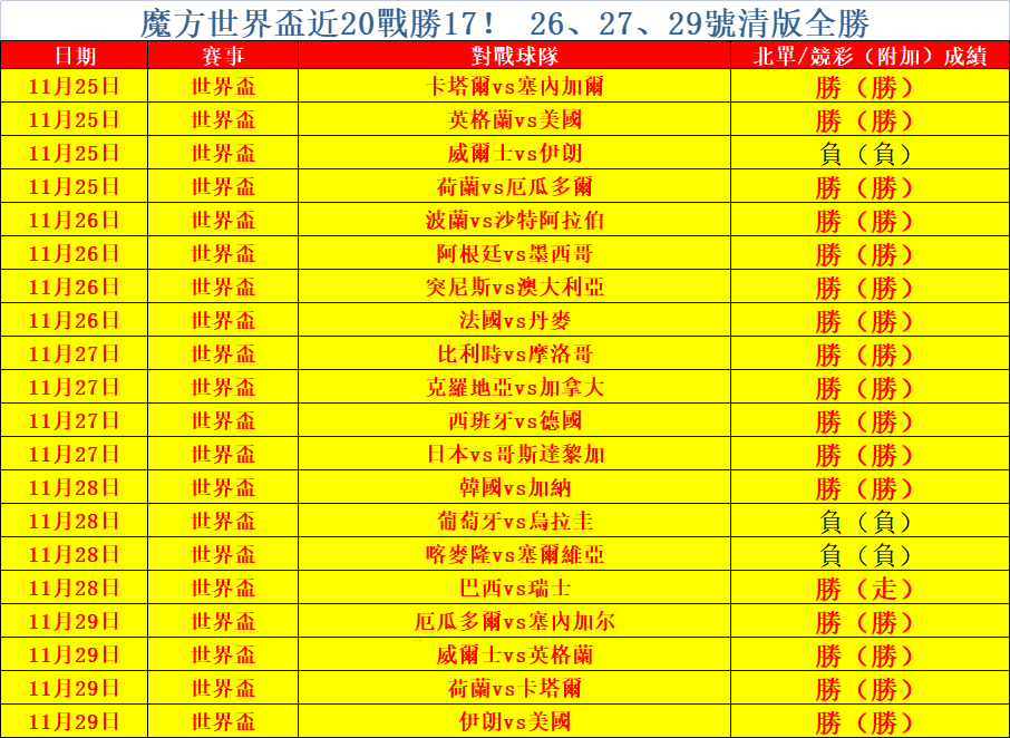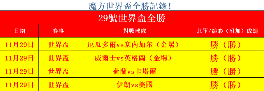 魔方昨日世界盃再次拿下4場全勝,本屆世界盃賽事已屡次拿下當天全勝記錄,近20場勝17場,此中2六、2七、29號三天清版全勝4勝4,成績非常耀眼!世界盃金場获得了12勝11的佳績!昔日繼續深研世界盃賽事與各人分享。魔方將繼續致力,谋求锦上添花。