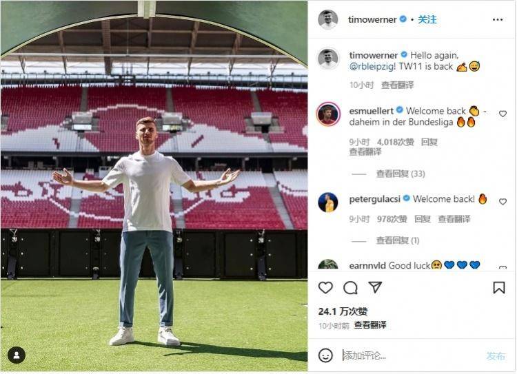 TW11归来!维尔纳晒亮相照,穆勒评论:欢迎回归