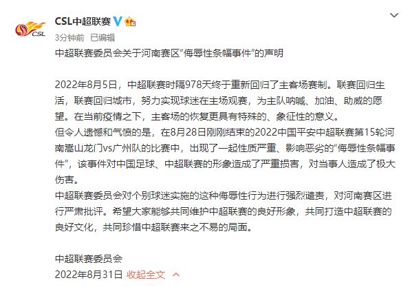 亚博体育8月31日报道:北京时间8月31日,中超官方对河南赛区“侮辱性条幅事件”表示强烈谴责。此前,在河南与广州的比赛中,有激进的河南球迷悬挂了主裁判马宁的“遗像”。相关阅读 河南队就侮辱性条幅事件向马宁道歉:将改进不足2022年8月5日,中超联赛时隔978天终于重新回归了主客场赛制。联赛回归生活,