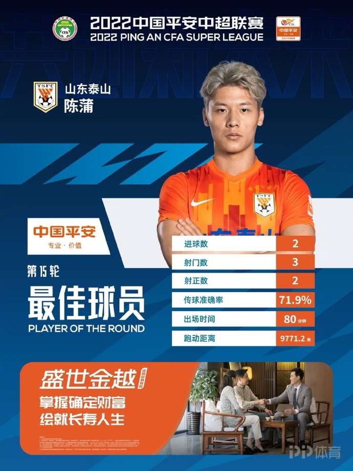 中超官方:山东泰山球员陈蒲当选第15轮最佳球员
