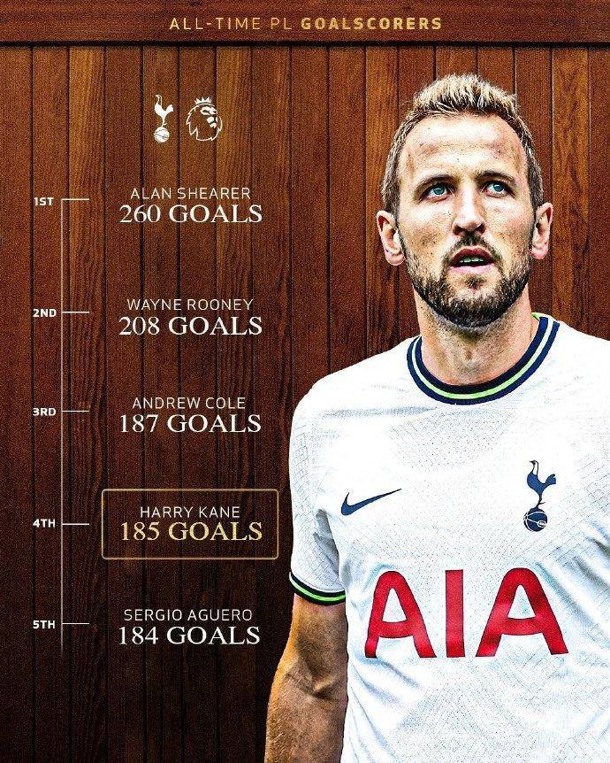 185粒英超进球凯恩已升至英超历史射手榜第4️⃣位
