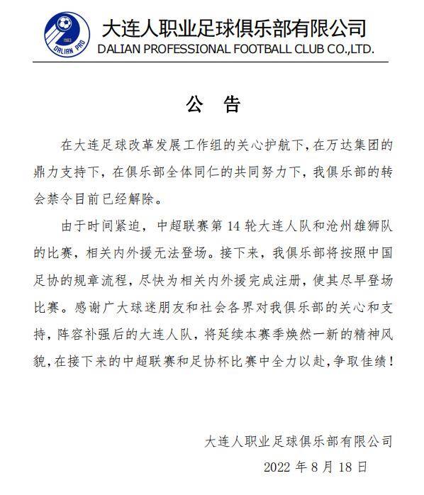 正在年夜连足球变革倒退工作组的关怀护航下,正在万达团体的大力支持下,正在俱乐部整体同仁的独特致力下,我俱乐部的转会禁令今朝曾经解除了。 因为工夫紧急,中超联赛第14轮年夜连人队以及沧州雄狮队的较量,相干表里援无奈退场。接上去,我俱乐部将依照中国足协的规章流程,尽快为相干表里援实现注册,使其及早退场