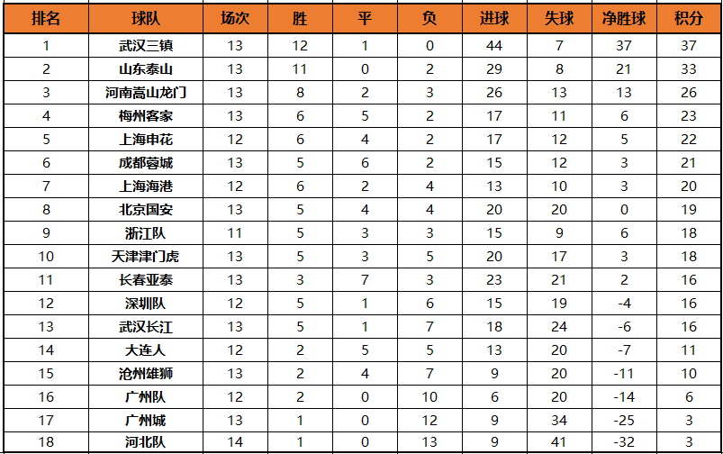 中超积分榜:武汉三镇4分领跑 河北队连续惨败垫底