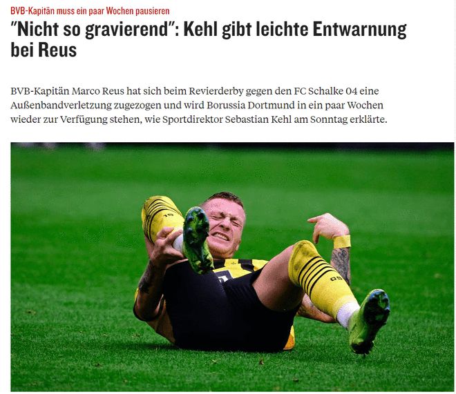万幸!罗伊斯脚踝受伤缺阵1个月 不会错过世界杯
